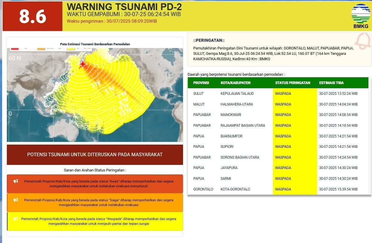 JELAJAHSULUT.COM, Jakarta — Gempabumi tektonik berkekuatan Magnitudo 8,7 mengguncang wilayah pesisir timur Kamchatka, Rusia, pada Rabu pagi, 30 Juli 2025 pukul 06.24 WIB. Berdasarkan hasil analisis Badan Meteorologi, Klimatologi, dan Geofisika (BMKG), gempa tersebut berpotensi menimbulkan tsunami di sejumlah wilayah di Indonesia.