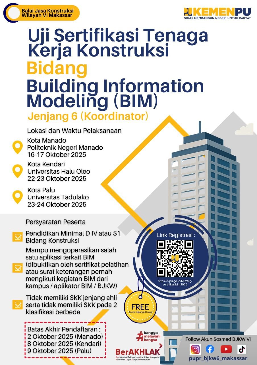 JELAJAHSULUT.COM – Politeknik Negeri Manado (Polimdo) akan menjadi salah satu lokasi pelaksanaan Uji Sertifikasi Tenaga Kerja Konstruksi Bidang Building Information Modeling (BIM) Jenjang 6 (Koordinator). Kegiatan ini digelar oleh Balai Jasa Konstruksi Wilayah VI Makassar, Kementerian PUPR, pada 16–17 Oktober 2025.