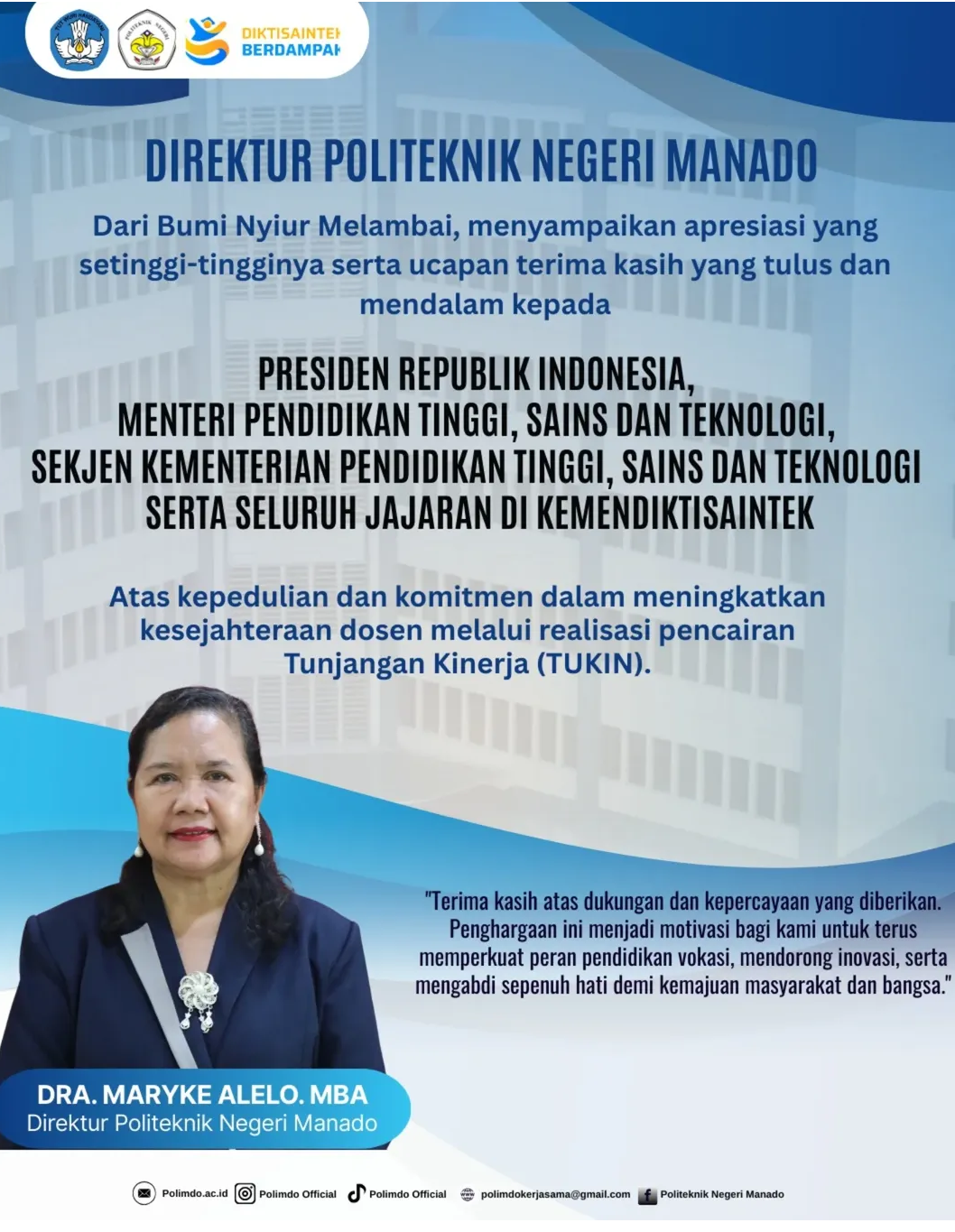Rasa terimakasih ini sebagai bentuk sebagai bentuk penghargaan atas kepedulian pemerintah pusat terhadap insan pendidikan vokasi, khususnya di lingkungan Politeknik Negeri Manado.