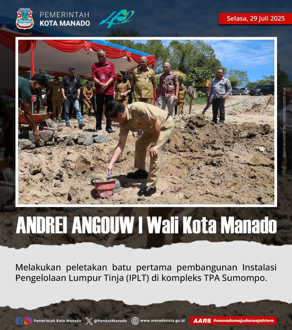 MANADO, JELAJAHSULUT.COM – Pemerintah Kota Manado resmi memulai pembangunan Instalasi Pengelolaan Lumpur Tinja (IPLT) di kompleks Tempat Pembuangan Akhir (TPA) Sumompo, Selasa (29/7/2025). Peletakan batu pertama dilakukan langsung oleh Wali Kota Manado, Andrei Angouw, disaksikan jajaran pejabat pemkot serta perwakilan instansi terkait.